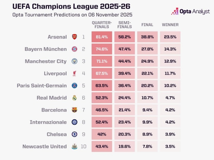 欧冠夺冠概率:阿森纳超23%断档领跑,拜仁曼城
