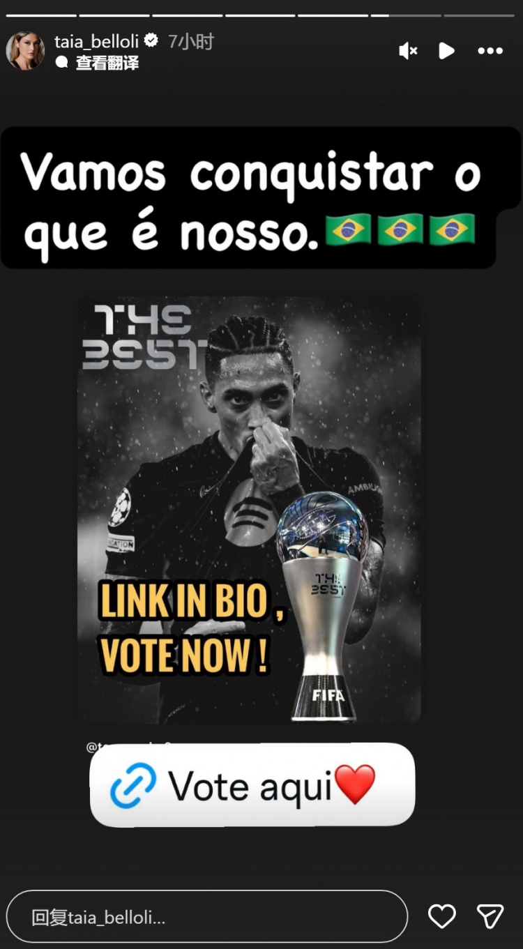 足球比分网11月7日讯 拉菲尼亚入围FIFA最佳球员候选名单,妻子娜塔莉亚社媒为他拉票。 娜塔莉亚社媒晒出投票链接,配文:“让我们去赢得属于我们的荣誉!” |