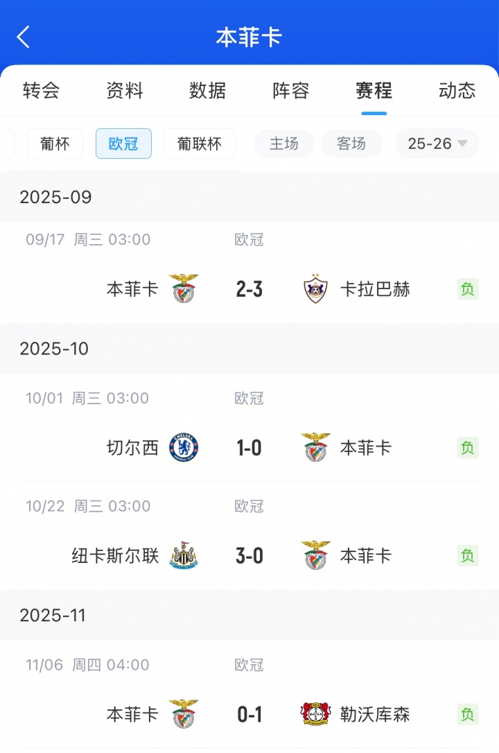 足球比分网11月06日讯 欧冠联赛阶段第4轮,本菲卡主场0-1不敌勒沃库森,本赛季欧冠4战全负,0分进2球丢8球排倒数第二。 穆里尼奥时隔5年半回归欧冠,遭遇欧冠3连败,先后客负切尔西和纽卡、主场输给勒沃库森,丢5球一球未进。 欧冠4轮比赛过后,本菲卡0分排名倒数第二,之后还将与垫底的阿贾克斯(客)、第24的那不勒斯(主)、第26的尤文(客)和第7的皇马(主)交手,赛程难度拉满。
