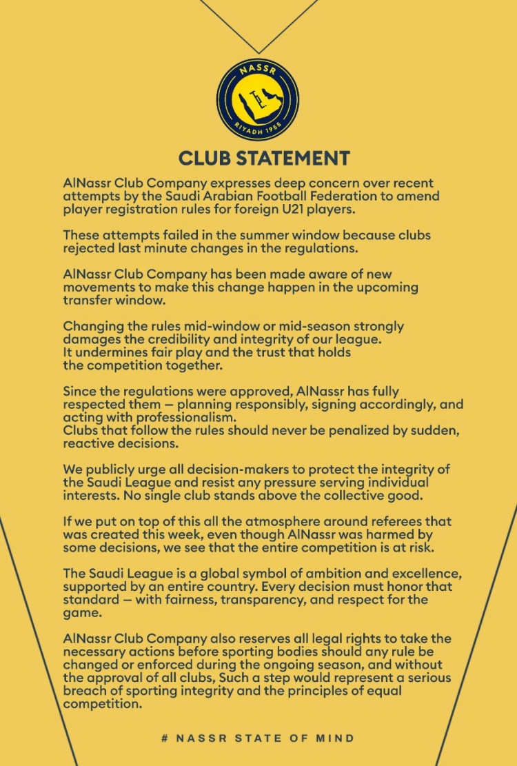 足球比分网11月7日讯 利雅得胜利俱乐部发表官方声明,俱乐部对沙特阿拉伯足球联合会近期试图修改外籍U21球员注册规则表示深切关注。 声明表示: 这些尝试在夏季转会窗口未能成功,因为各俱乐部拒绝了在最后一刻更改规则的提议。俱乐部已经了解到,新的动向可能会在即将到来的转会窗口中推动这一变更。 在赛季中期或转会窗口期间更改规则,严重损害了联赛的信誉和完整性,破坏了公平竞争和维持比赛的信任基础。自规则批准以来,我们一直严格遵守,负责任地规划、签约并以专业态度行事。遵循规则的俱乐部不应因突然的、反应性的决定而受到惩罚。 我们公开呼吁所有决策者保护沙特联赛的完整性,抵制任何服务于个人利益的压力。没有任何一家俱乐部凌驾于集体利益之上。此外,本周围绕裁判产生的种种争议,尽管我们受到了一些判罚的影响,但我们看到整个比赛都处于风险之中。 沙特联赛是全球雄心和卓越的象征,得到了整个国家的支持。每一项决定都必须符合这一标准——公平、透明并尊重比赛。 俱乐部保留采取必要法律行动的权利,如果在赛季进行过程中未经所有俱乐部同意而更改或执行任何规则,这将被视为对体育诚信和平等竞争原则的严重违反。 |