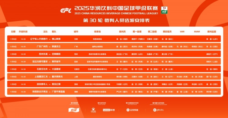 中甲第30轮裁判安排:广东广州豹vs南通支云等