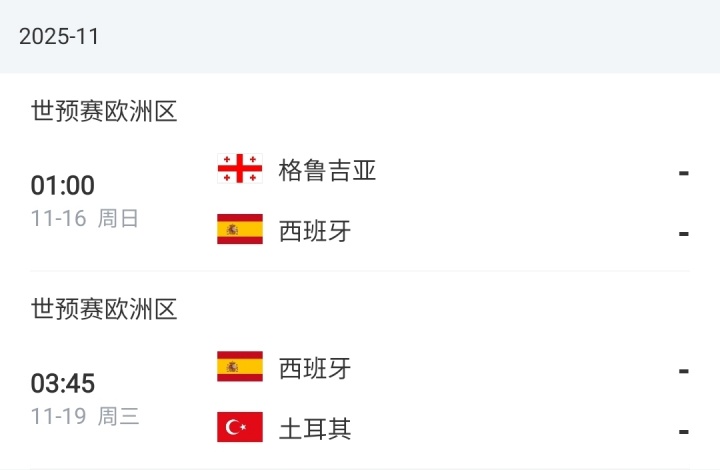 足球比分网11月07日讯 西班牙公布11月世预赛名单,目前西班牙4战全胜在世预赛欧洲区E组排名第1,领先第二名的土耳其3分。亚马尔领衔巴萨5人入选,皇马仅赫伊森1人入选,罗德里、卡瓦哈尔、佩德里伤缺。 西班牙名单↓ 门将:乌奈-西蒙(毕尔巴鄂)、拉亚(阿森纳)、雷米罗(皇家社会) 后卫:拉波尔特(毕尔巴鄂)、维维安(毕尔巴鄂)、格里马尔多(勒沃库森)、马科斯-略伦特(马竞)、库库雷利亚(切尔西)、库巴西(巴萨)、赫伊森(皇家马德里)、波罗(热刺) 中场:法比安(巴黎)、苏维门迪(阿森纳)、梅里诺(阿森纳)、阿莱克斯·加西亚(勒沃库森)、巴里奥斯(马竞)、巴埃纳(马竞)、福纳尔斯(贝蒂斯) 前锋:奥亚萨瓦尔(皇家社会)、皮诺(水晶宫)、奥尔莫(巴萨)、费尔明(巴萨)、亚马尔(巴萨)、费兰(巴萨)、阿格霍瓦(波尔图)、伊格莱西亚斯(塞尔塔) 西班牙11月赛程↓