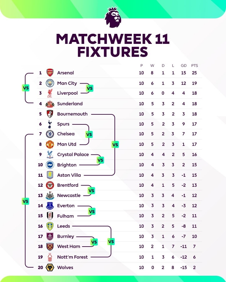 足球比分网11月07日讯 本周末将迎来英超第11轮的较量,赛前英超官方用一张图表清晰展示了本轮交手各队的名次对比。 本轮英超将迎来多场焦点战,其中积分榜前四捉对厮杀最为瞩目,领头羊阿森纳遭遇第四名桑德兰,第二曼城和第三利物浦将迎来重量级对决。 曼联和热刺也将迎来一场“BIG6”大战,此外,位于积分榜末7位的球队将有6支分别交手。