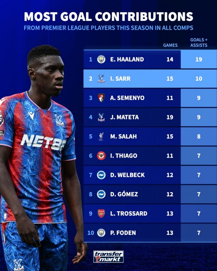 足球比分网11月7日讯 德国转会市场统计了英超球员本赛季各赛事的参与进球数量,并列出榜单,哈兰德参与19球居首,萨尔参与10球次席。 本赛季英超球员参与进球排名(所有赛事) 哈兰德(曼城)——14场19球 伊斯梅拉-萨尔(水晶宫)——15场10球 塞梅尼奥(伯恩茅斯)——11场9球 马特塔(水晶宫)——19场9球 萨拉赫(利物浦)——15场8球 伊戈尔-蒂亚戈(布伦特福德)——11场7球 维尔贝克(布莱顿)——12场7球 迭戈-戈麦斯(布莱顿)——12场7球 特罗萨德(阿森纳)——13场7球 福登(曼城)——13场7球 |