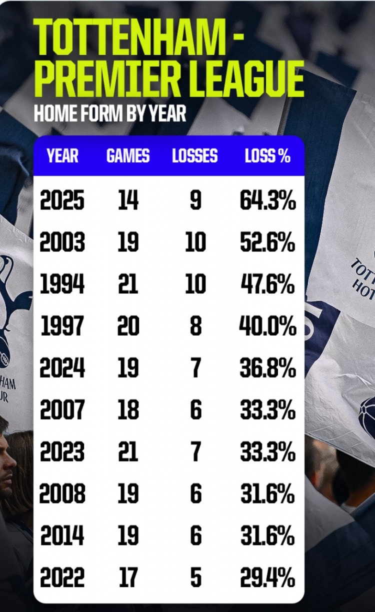 足球比分网11月7日讯 据Opta统计,热刺今年在主场参加14场英超比赛,输掉其中9场,主场败率64.3%,队史英超自然年输球率最高。 热刺此前只在1994年、2003年主场输球场次达到10场,而今年他们还有4场英超主场比赛。 热刺英超自然年败率排名: 2025——14场9负——64.3% 2003——19场10负——52.6% 1994——21场10负——47.6% 1997——20场8负——40.0% 2024——19场7负——36.8% 2007——18场6负——33.3% 2023——21场7负——33.3% 2008——19场6负——31.6% 2014——19场6负——31.6% 2022——17场5负——29.4% |