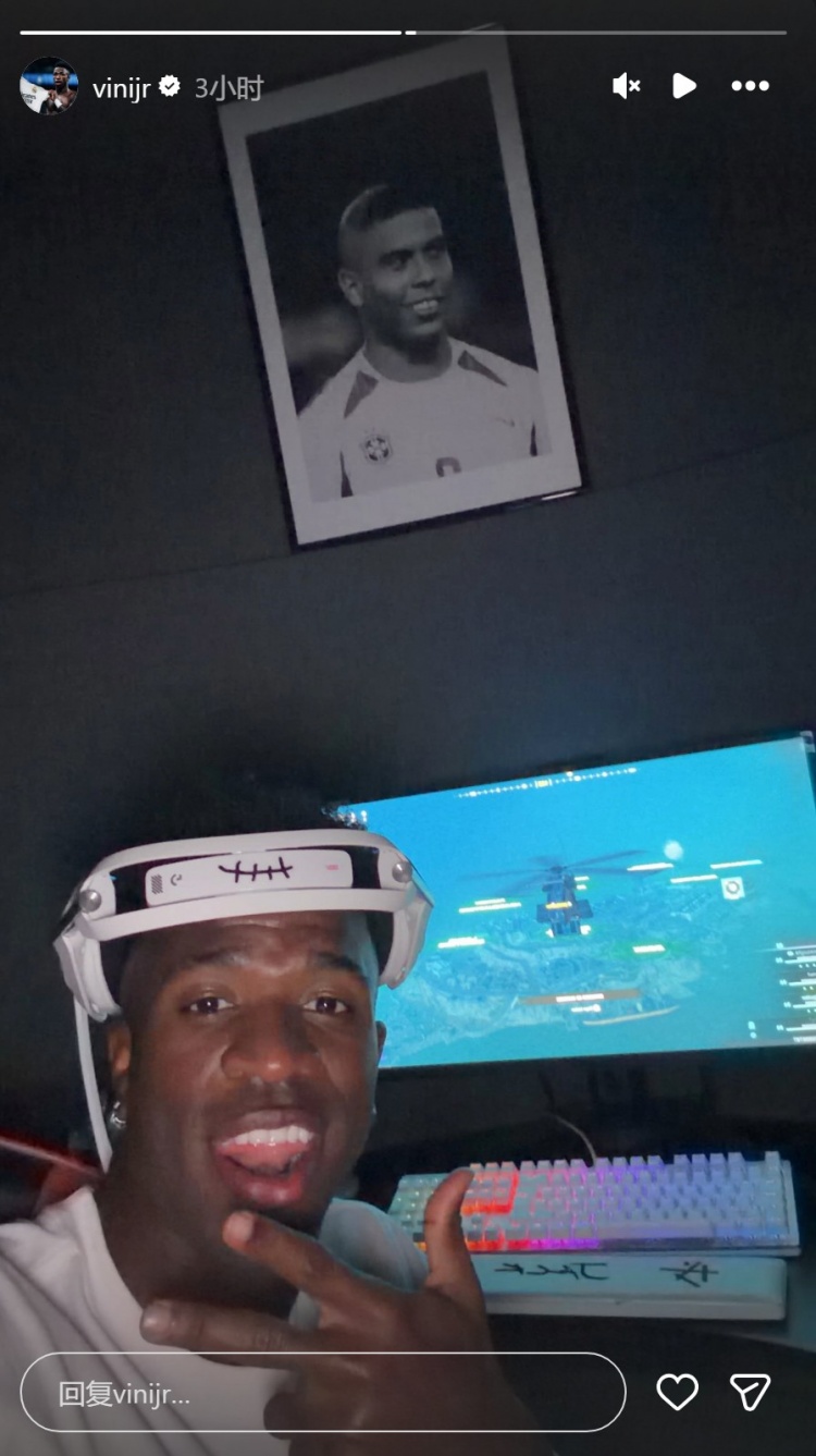 维尼修斯社媒晒打游戏照片,罗纳尔多海报出镜