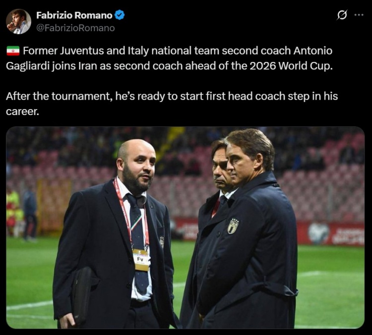 足球比分网11月8日讯 罗马诺报道,前尤文、意大利国家队助理教练加利亚尔迪(上图图左)加入伊朗国家队教练组,担任助理教练,备战2026年世界杯。 在此次赛事结束后,他准备迈出执教生涯中担任主教练的第一步。 加利亚尔迪现年42岁,此前曾担任尤文技术教练、意大利国家队首席分析师,还曾担任帕尔马助教、沙特国家队技术教练。 |