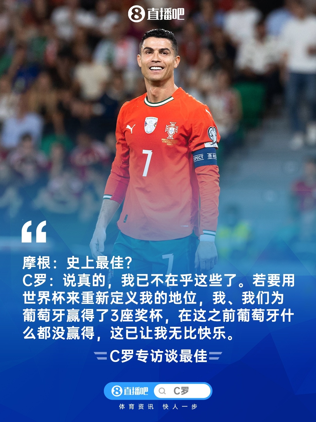 相关阅读↓ 【完整版】C罗专访第二弹:谈若塔、世界杯、世界和平、詹姆斯...