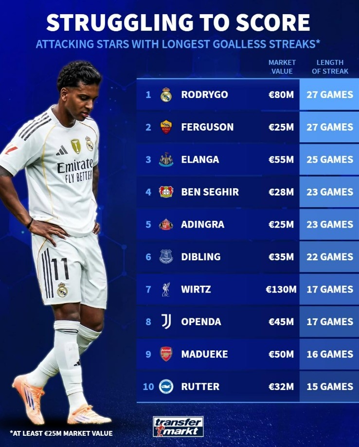 足球比分网11月8日讯 德转盘点了目前遭遇进球荒的攻击手,其中罗德里戈27连续27场进球荒居首,以下为具体情况(只统计身价2500万欧以上球员): 1、罗德里戈(皇马)27场,身价8000万欧 2、弗格森(罗马)27场,身价2500万欧 3、伊兰加(纽卡)25场,身价5500万欧 4、本-塞吉尔(勒沃库森)23场,身价2800万欧 5、阿迪格拉(桑德兰)23场,身价2500万欧 6、迪布林(埃弗顿)22场,身价3500万欧 7、维尔茨(利物浦)17场,身价1.3亿欧 8、奥蓬达(尤文)17场,身价4500万欧 9、马杜埃凯(阿森纳)16场,身价5000万欧 10、鲁特尔(布莱顿)15场,身价3200万欧