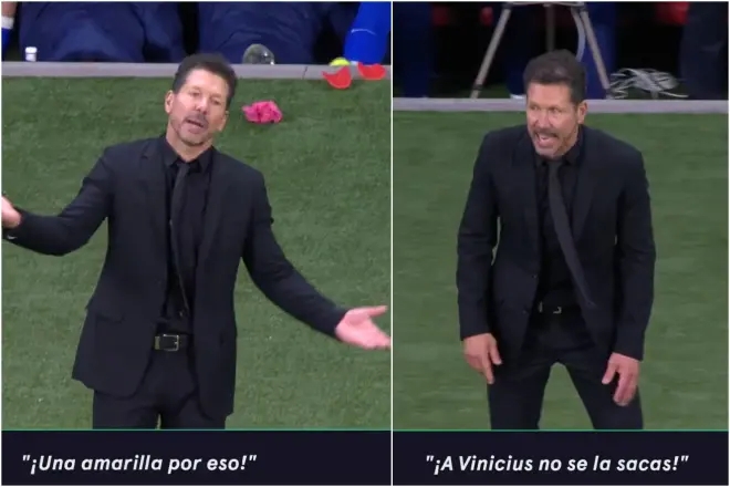 比赛第84分钟,莫利纳吃到黄牌,随后第87分钟和第90分钟,略伦特、吉梅内斯又先后染黄。 在一次犯规判罚之后,镜头拍到了马竞主帅西蒙尼正在对主裁曼萨诺抗议:“嘿!你在吹什么!冷静点!就为了这个出牌?”西蒙尼最后又摇着头说:“你不敢对维尼修斯出牌。”然后他又盯着第四官员重复了一遍这句话。 |