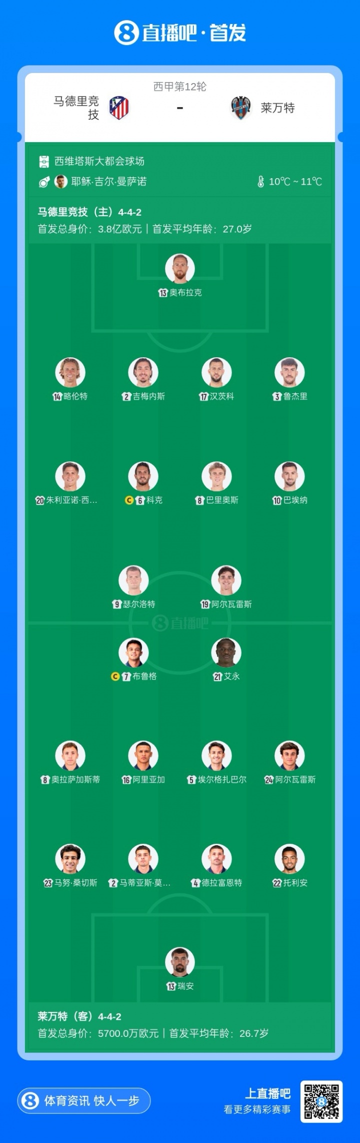 马竞vs莱万特首发:阿尔瓦雷斯、小西蒙尼、瑟尔