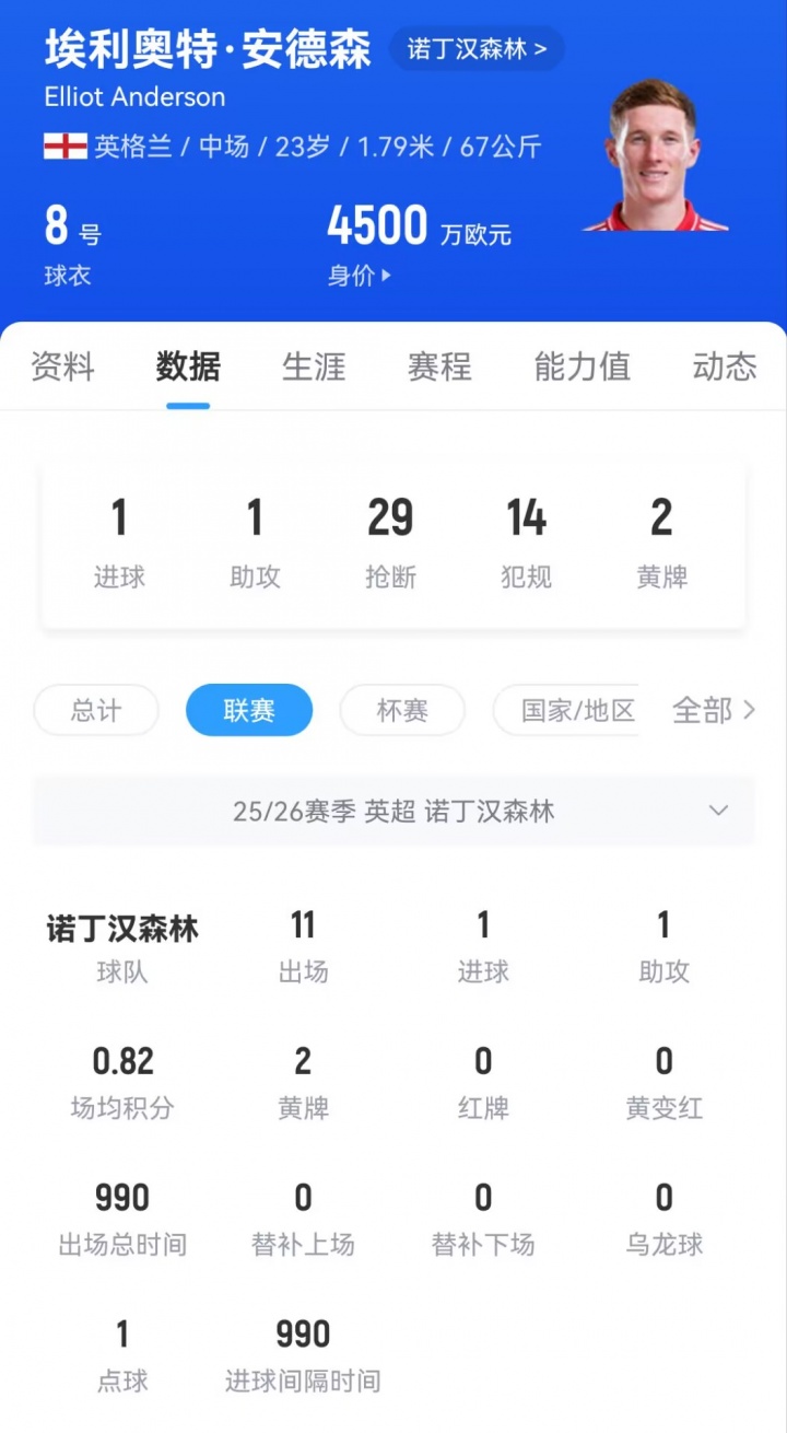 足球比分网11月11日讯 德天空记者普莱滕伯格报道称,曼联有意森林中场安德森。 该记者写道:“了解到曼联仍然热衷于埃利奥特·安德森,已对他产生了明确的兴趣。诺丁汉森林已经得到了消息,仍要求支付1亿-1.2亿英镑的费用。” 23岁的森林中场埃利奥特·安德森本赛季为森林在联赛已出场11次,贡献1球1助攻。目前他的德转身价为4500万欧元。