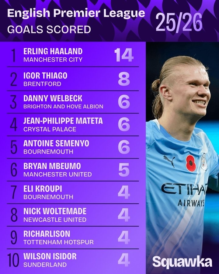 足球比分网11月11日讯 英超联赛已经进行了11轮,squakwa也统计了本赛季英超进球数,哈兰德14球断崖领跑。 本赛季英超进球榜: 1.埃尔林·哈兰德,曼城,14球 2.伊戈尔·蒂亚戈,布伦特福德,8球 3.丹尼·维尔贝克,布莱顿,6球 4.简·菲利普·马特塔,水晶宫,6球 5.安托万·塞梅尼奥,伯恩茅斯,6球 6.布莱恩·姆伯莫,曼联,5球 7.埃利·克鲁皮,伯恩茅斯,4球 8.尼克·沃尔特马德,纽卡斯尔联,4球 9.里沙利松,托特纳姆热刺,4球 10.威尔森·伊西多,桑德兰,4球