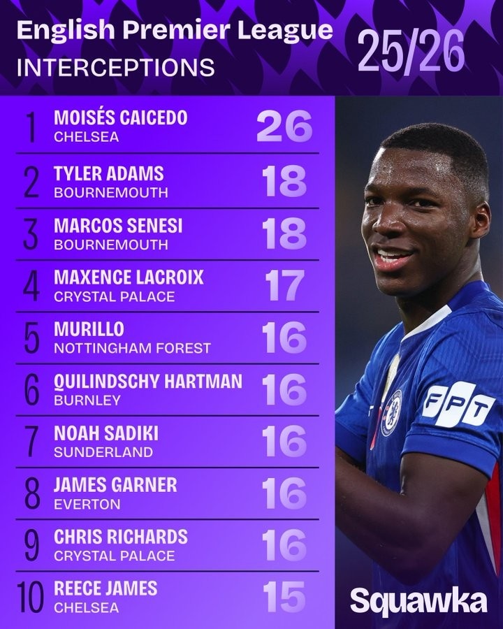 足球比分网11月11日讯 英超联赛已经进行了11轮,squakwa也统计了本赛季英超拦截次数情况,凯塞多独自领跑。 本赛季英超拦截榜: 1.莫伊塞斯·凯塞多,切尔西,26次 2.泰勒·亚当斯,伯恩茅斯,18次 3.马科斯·塞内西,伯恩茅斯,18次 4.马克尚斯·拉克鲁瓦,水晶宫,17次 5.穆里略,诺丁汉森林,16次 6.奎林奇·哈特曼,伯恩利,16次 7.诺亚·萨迪基,桑德兰,16次 8.詹姆斯·加纳,埃弗顿,15次 9.克里斯·理查兹,水晶宫,15次 10.里斯·詹姆斯,切尔西,15次 |