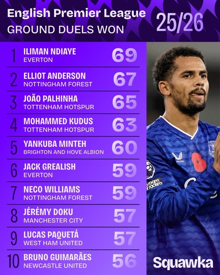 足球比分网11月11日讯 英超联赛已经进行了11轮,squakwa也统计了本赛季英超地面成功对抗次数,埃弗顿前锋恩迪亚耶居首。 本赛季英超地面成功对抗榜: 1.伊利曼·恩迪亚耶,埃弗顿,69次 2.埃利奥特·安德森,诺丁汉森林,67次 3.若昂·帕利尼亚,托特纳姆热刺,65次 4.默罕穆德·库杜斯,托特纳姆热刺,63次 5.扬库巴·明特,布莱顿,60次 6.杰克·格拉利什,埃弗顿,59次 7.内科·威廉姆斯,诺丁汉森林,59次 8.杰里米·多库,曼城,57次 9.卢卡斯·帕奎塔,西汉姆联,57次 10.布鲁诺·吉马良斯,纽卡斯尔联,56次 |