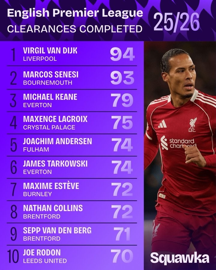 本赛季英超解围榜:范戴克压塞内西居首,基恩