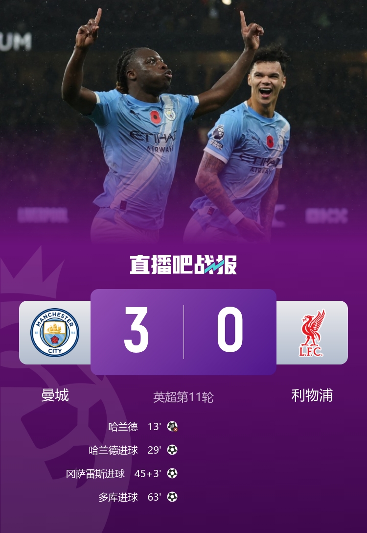 【比赛战报】 距榜首4分!曼城3-0利物浦 哈兰德失点+头球破门多库世界波+造点