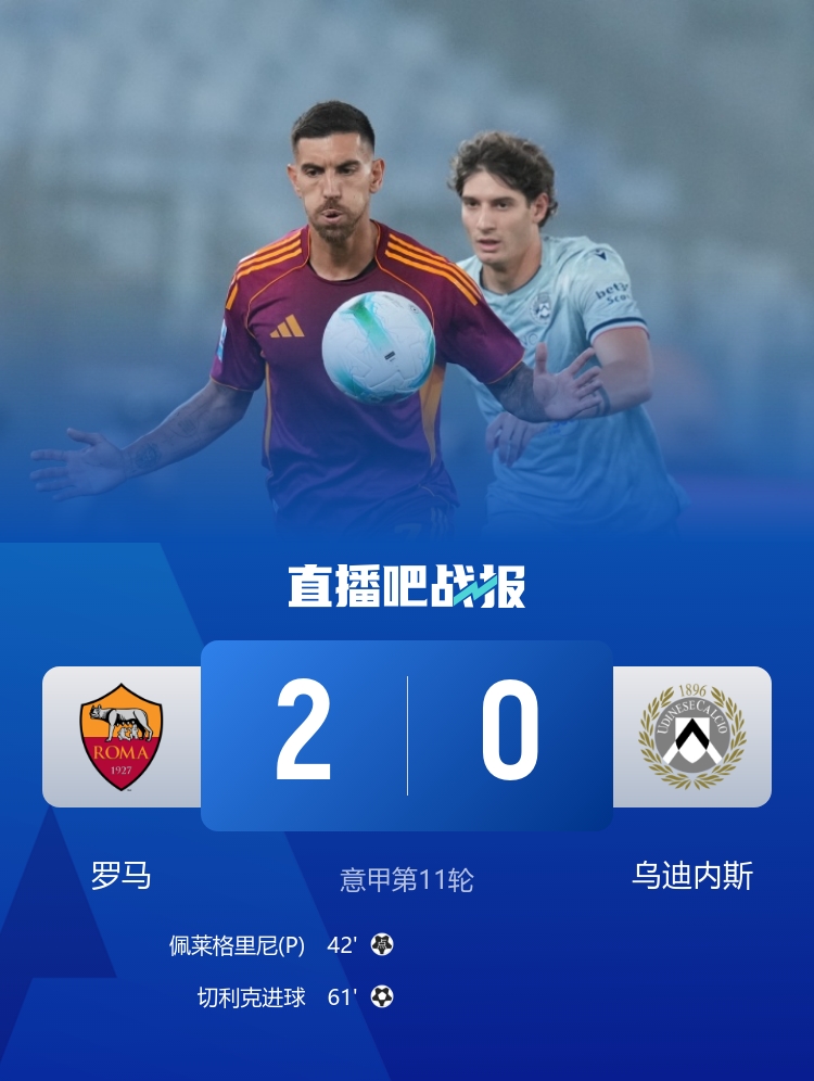 意甲第11轮,罗马2-0战胜乌迪内斯,佩莱格里尼、切利克进球。 连续2轮绝杀!巴黎3-2十人里昂2分领跑 内维斯绝杀埃梅里K77破门