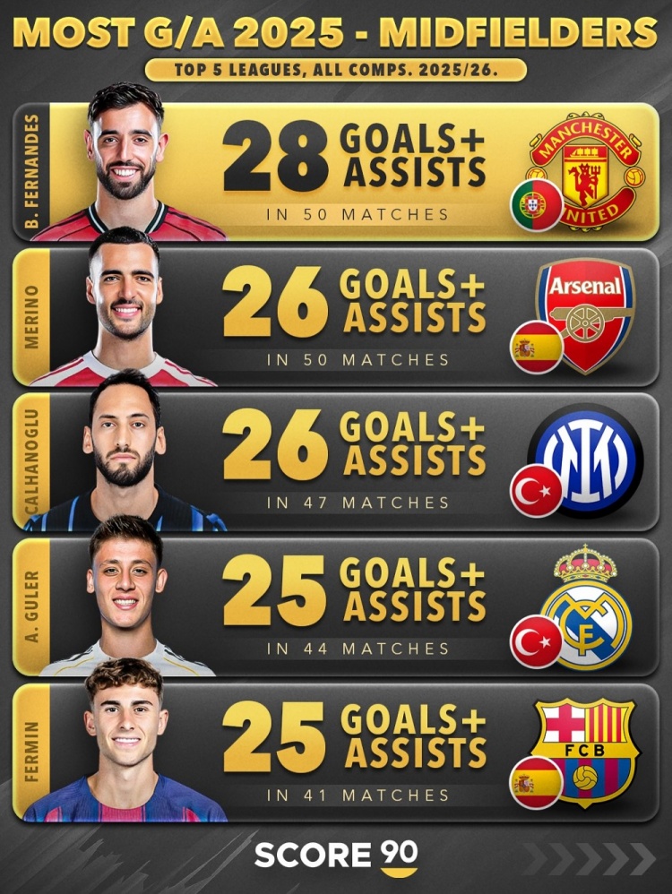足球比分网11月10日讯 Score90统计了2025年五大联赛中场球员在俱乐部+国家队比赛中参与进球的数量,并列出榜单。 2025年五大联赛中场球员参与进球榜: B费——50场28球 梅里诺——50场26球 恰尔汗奥卢——47场26球 居莱尔——44场25球 费尔明——41场25球