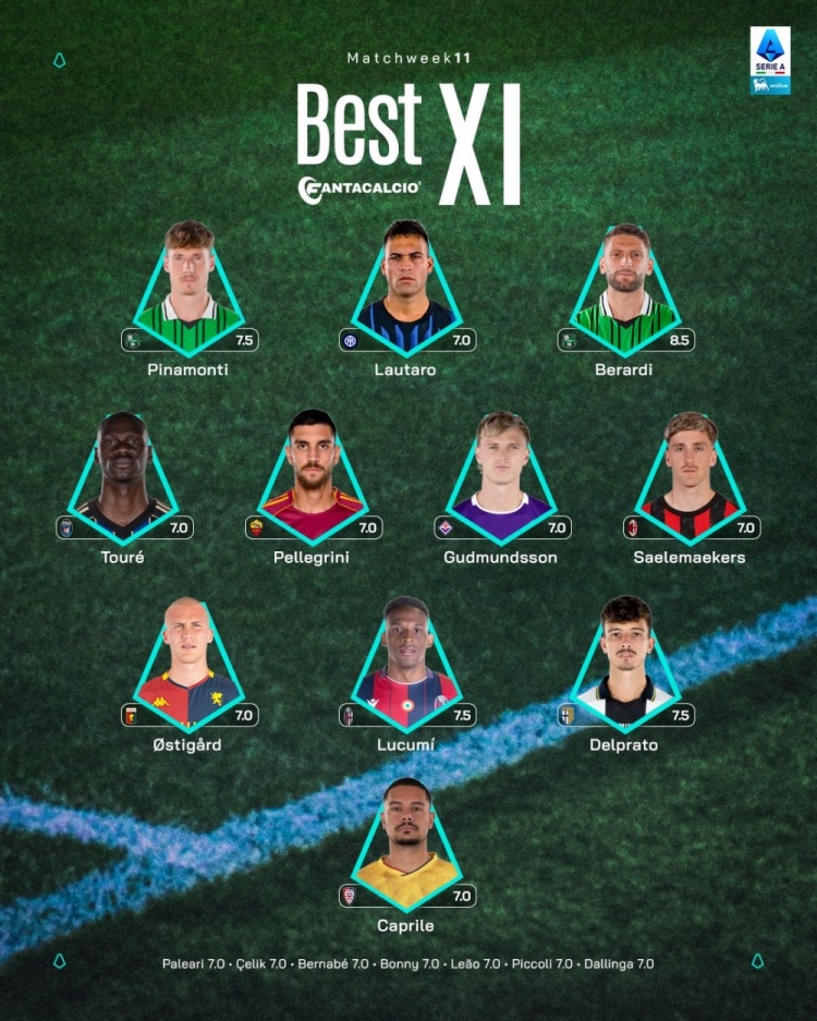 意甲官方第11轮最佳阵:劳塔罗、萨56领衔,佩莱