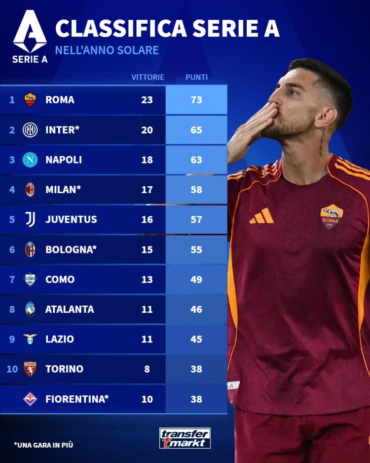 2025年意甲积分榜:罗马73分居首,国米65分、那不