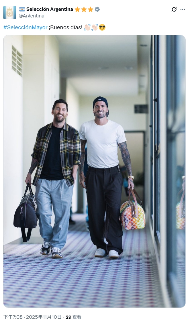 依旧德保镖!梅西与德保罗抵达阿根廷队集训营 时间: 2025-11-11 来源: 网络 作者: admin 梅西与德保罗抵达阿根廷国家队本月在西班牙的集训营阿根廷队官方:早上好! 上一篇:每体:巴萨不知梅西回诺坎普 球场目前关闭 不清 下一篇:世体:梅西今天要到阿根廷队报到,在此之前他
