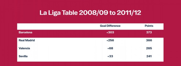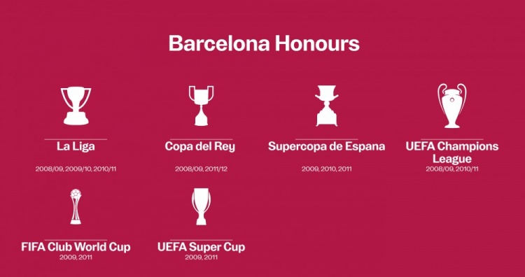 瓜迪奥拉执教巴萨期间所获得的荣誉 转机来自克鲁伊夫的及时干预。 “克鲁伊夫在报纸上写了一篇专栏文章,告诉球迷不必担心,因为他们踢得非常好,只是运气不佳。从那里展开的一切证明他是正确的。”08/09赛季,瓜迪奥拉带领巴萨赢得了史无前例的三冠王,但这仅仅是个开始。在接下来的四年里,巴萨豪取十四个重要奖杯,包括三次西甲冠军和两次欧冠冠军。更令人惊叹的是球队展现出的恐怖统治力——在那四个赛季里,巴萨在联赛中豪取373分,净胜球达到惊人的303个。在他执教的247场比赛中,胜率高达72.5%,这是一个近乎梦幻的数字。