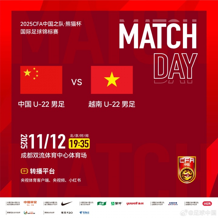 2025CFA中国之队·熊猫杯国际足球锦标赛首轮 ⚽️中国U-22男足VS越南U-22男足 ⏰北京时间2025年11月12日19:35 请查收转播计划,锁定以下平台一起为中国U-22男足加油!