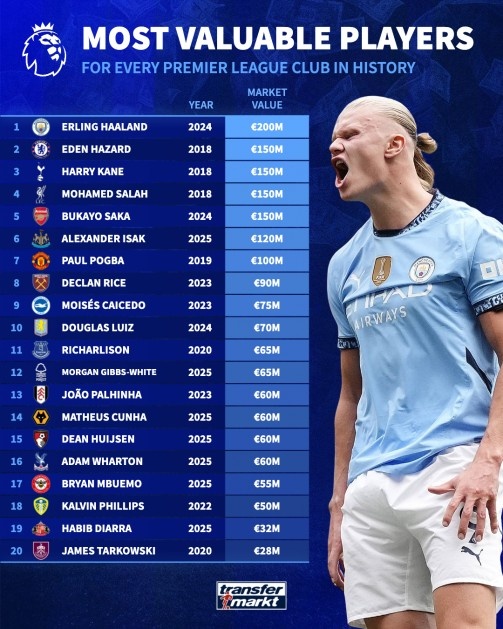 足球比分网11月12日讯 德国转会市场盘点了英超各队历史身价最高球员,哈兰德以2亿欧居首,阿扎尔、凯恩、萨拉赫和萨卡均为1.5亿欧。 以下为具体排行情况: 1、哈兰德(曼城,2024年):2亿欧 2、阿扎尔(切尔西,2018年):1.5亿欧 3、凯恩(热刺,2018年):1.5亿欧 4、萨拉赫(利物浦,2018年):1.5亿欧 5、萨卡(阿森纳,2024年):1.5亿欧 6、伊萨克(纽卡,2024年):1.2亿欧 7、博格巴(曼联,2019年):1亿欧 8、赖斯(西汉姆联,2023年):9000万欧元 9、凯塞多(布莱顿,2023年):7500万欧元 10、道格拉斯-路易斯(维拉,2024年):7000万欧元 11、里沙利松(埃弗顿,2020年):6500万欧元 12、吉布斯-怀特(诺丁汉森林,2025年):6500万欧元 13、帕利尼亚(富勒姆,2023年):6000万欧元 14、狼队(库尼亚,2025年):6000万欧元 15、赫伊森(伯恩茅斯,2025年):6000万欧元 16、亚当-沃顿(水晶宫,2025年):6000万欧元 17、姆伯莫(布伦特福德,2025年):6000万欧元 18、卡尔文-菲利普斯(利兹联,2022年):5000万欧元 19、哈比布-迪亚拉(桑德兰,2025年):3200万欧元 20、塔尔科夫斯基(伯恩利,2020年):2800万欧元