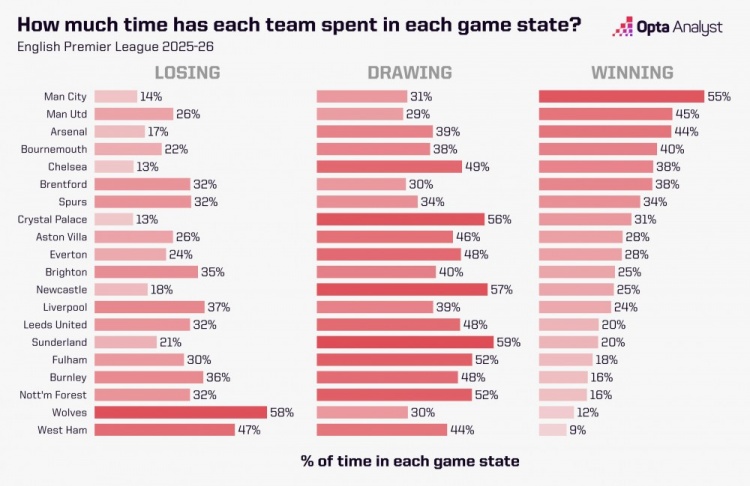 足球比分网11月12日讯 本赛季英超已经结束了11轮的争夺,OPTA统计了各队处在领先、落后以及均势时间占比情况,其中曼城平均每场比赛领先时间最长,达到总比赛时间的55%,而水晶宫和切尔西平均每场处在落后情况下的比赛时间最短,仅为总比赛时间的13%。 在平均领先时间方面,曼城、曼联和阿森纳位居前三,而卫冕冠军利物浦仅能位居第13位。