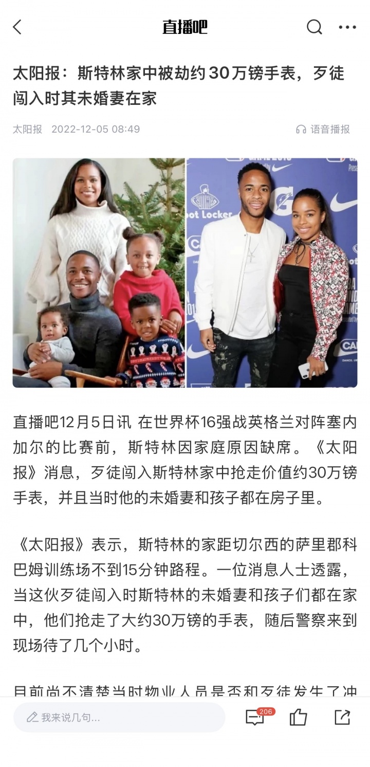 足球比分网11月11日讯 电讯报独家披露,切尔西前锋斯特林再度遭遇入室盗窃。 《每日电讯报》获悉,这起闯入事件于周六晚间约 6 点 30 分发生在他位于伯克郡的住所,这是斯特林的家庭住宅第二次成为目标。据称有蒙面男子试图闯入房屋,袭击的具体细节尚未明确。 泰晤士河谷警方向《每日电讯报》体育版证实,已对 “周六下午6点30分前发生的一起入室盗窃案” 展开调查。 警方发言人补充道:“警方正在进行全面调查,呼吁任何掌握相关信息或在该地区看到形迹可疑人员的民众与警方联系。” 2022年12月卡塔尔世界杯期间,斯特林因家庭住宅遭劫突然离开英格兰队驻地,随后在四分之一决赛前归队。