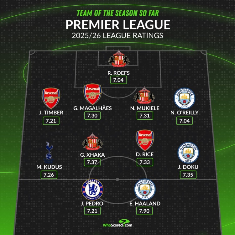 足球比分网11月11日讯 WhoScored根据球员的场均积分列出了本赛季至今英超最佳阵容,哈兰德、若昂-佩德罗、赖斯在列。 WhoScored本赛季至今英超最佳阵容: 门将:罗夫斯(桑德兰) 后卫:廷伯(阿森纳)、加布里埃尔(阿森纳)、穆基勒(桑德兰)、奥赖利(曼城) 中场:库杜斯(热刺)、扎卡(桑德兰)、赖斯(阿森纳)、多库(曼城) 前锋:若昂-佩德罗(切尔西)、哈兰德(曼城) |