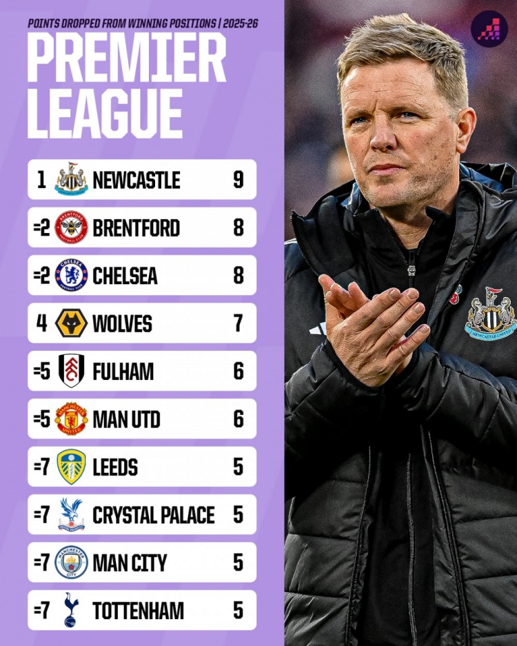 本赛季英超领先之后丢分榜:纽卡9分最多,小蜜