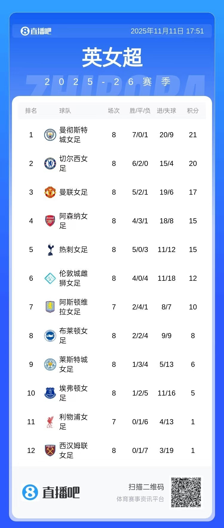 足球比分网11月11日讯 本赛季女足英超已经战罢8轮,最新积分榜情况如下: 曼城女足积21分领跑;切尔西女足以1分之差紧随其后;曼联女足17分排在第3;阿森纳女足15分暂居第4;热刺女足同样是积15分,但因净胜球劣势排在第5。 伦敦城雌狮女足12分排在第6,这家俱乐部由黛安-卡利根于2019年创立,是女足英超、女足英冠两个级别联赛中唯一一家未依附于男足俱乐部、完全独立创建的女足俱乐部,她们于2025年5月历史首次升入女足英超联赛。 利物浦女足(第11)和阿斯顿维拉女足(第7)目前少赛一场,她们之间的第3轮补赛将在12月11日举行。