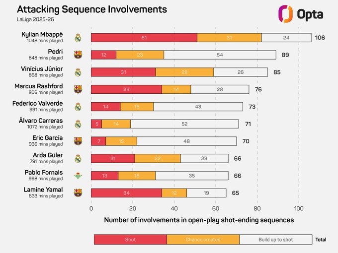 足球比分网11月12日讯 据Opta统计,姆巴佩本赛季联赛参与106次以射门终结的进攻,西甲球员中最多。 本赛季西甲参与有效进攻排名: 姆巴佩(皇马)——射门51次+创造机会31次+策动组织24次——106 佩德里(巴萨)——射门12次+创造机会23次+策动组织54次——89 维尼修斯(皇马)——射门31次+创造机会28次+策动组织26次——85 拉什福德(巴萨)——射门34次+创造机会14次+策动组织28次——76 巴尔韦德(皇马)——射门14次+创造机会16次+策动组织43次——73 卡雷拉斯(皇马)——射门5次+创造机会14次+策动组织52次——71 埃里克·加西亚(巴萨)——射门7次+创造机会15次+策动组织48次——70 居莱尔(皇马)——射门21次+创造机会22次+策动组织23次——66 福纳尔斯(贝蒂斯)——射门21次+创造机会18次+策动组织35次——66 亚马尔(巴萨)——射门34次+创造机会12次+策动组织19次——65