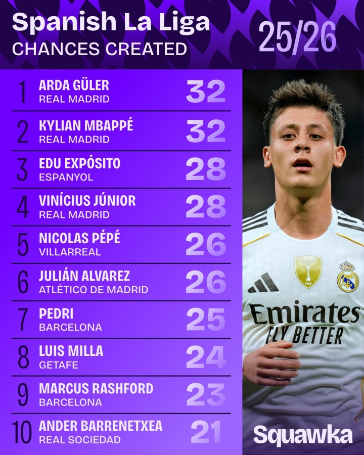 足球比分网11月12日讯 Squawka统计本赛季西甲创造机会次数,居莱尔、姆巴佩32次最多。 本赛季西甲创造机会次数: 1、居莱尔(皇马):32次 姆巴佩(皇马):32次 3、爱德华多·埃克斯波西托(西班牙人):28次 维尼修斯(皇马):28次 5、佩佩(比利亚雷亚尔):26次 阿尔瓦雷斯(马竞):26次 7、佩德里(巴萨):25次 8、路易斯·米拉(赫塔费):24次 9、拉什福德(巴萨):23次 10、巴雷内切亚(皇家社会):21次