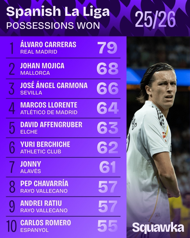 足球比分网11月12日讯 在球场上,皇马后卫阿尔瓦罗-卡雷拉斯以作风强硬,拼劲十足著称。根据Squawka的数据统计,卡雷拉斯是本赛季西甲夺回球权最多的球员,达到了79次。 以下为本赛季西甲球员夺回球权次数排行榜: 1、阿尔瓦罗-卡雷拉斯(皇马):79次 2、莫西卡(马洛卡):68次 3、卡尔莫纳(塞维利亚):66次 4、马科斯-略伦特(马竞):64次 5、阿芬格鲁伯(埃尔切):63次 6、贝尔奇切(毕尔巴鄂):62次 7、乔尼(阿拉维斯):61次 8、查瓦里亚(巴列卡诺):57次 9、拉蒂乌(巴列卡诺):57次 10、卡洛斯-罗梅罗(西班牙人):55次