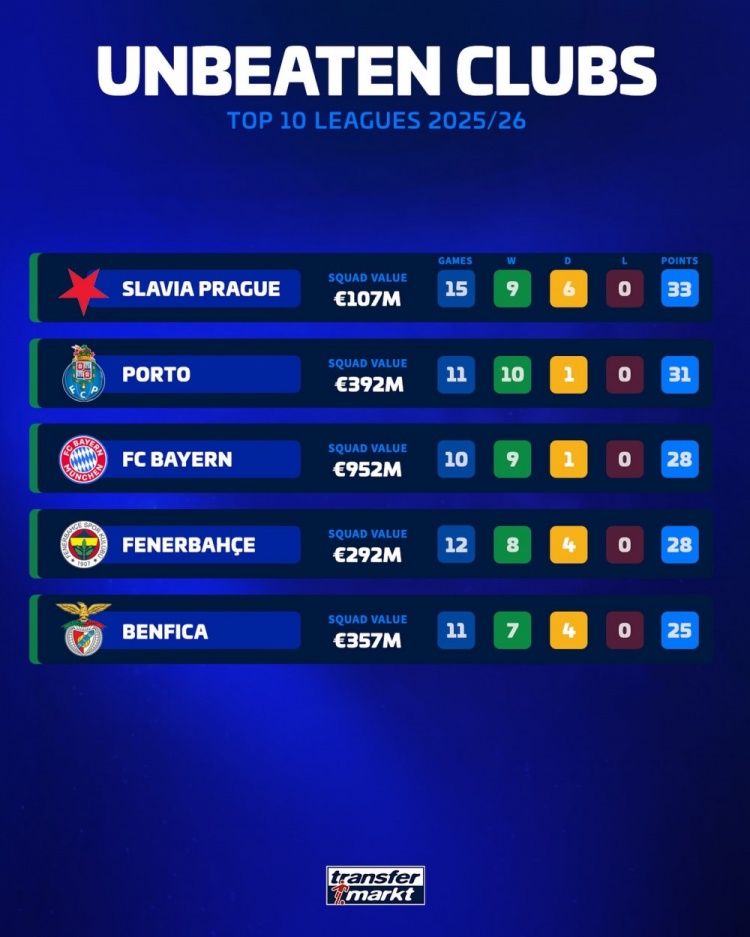 本赛季前10联赛仅5队不败:拜仁、费内巴切、波