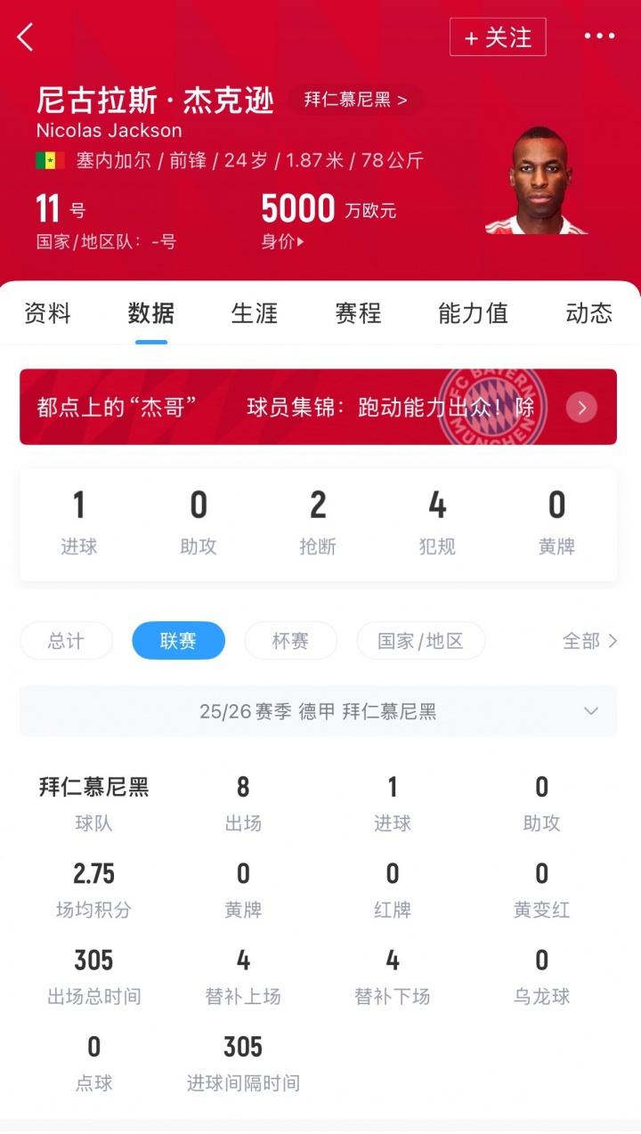 8轮1球!图片报:杰克逊至今仅5次首发,拜仁不