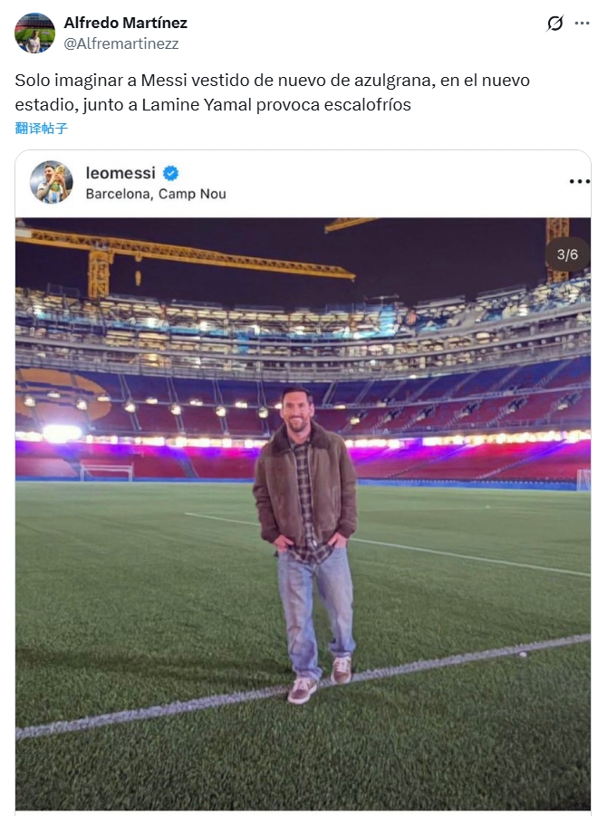 足球比分网11月11日讯 梅西夜访诺坎普引起的轰动还在继续。梅西在社媒的配文中写道:“但愿有天我能归来,不止是以球员身份作别。” 记者Alfredo Martínez表示:光是想象梅西再次身披红蓝战袍,在新球场与拉明·亚马尔并肩作战的画面,就足以让人激动战栗。 |