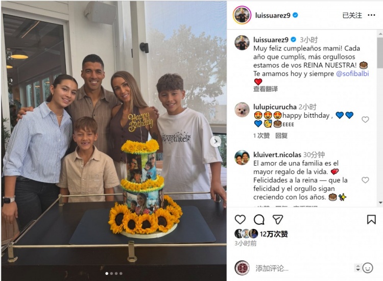 苏亚雷斯社媒晒全家合照为妻子庆生:我们为你
