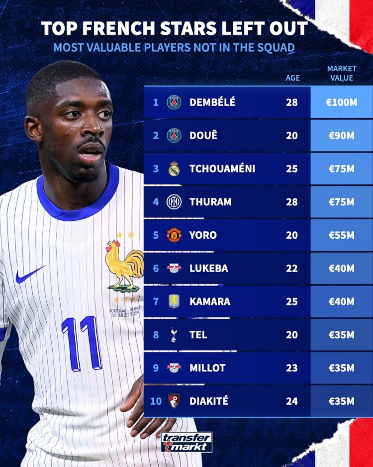 无缘本期法国队球员身价:登贝莱1亿欧最高,杜
