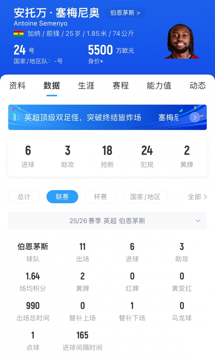 足球比分网11月13日讯 据英媒Caughtoffside报道,曼联有意在冬窗签下伯恩茅斯前锋塞梅尼奥。 消息称,曼联希望迅速行动,击败利物浦、阿森纳和曼城等队的竞争,在冬窗抢先签下塞梅尼奥。伯恩茅斯不愿出售这位核心球员,要价可能会超过6500万镑,甚至接近8000万镑。 然而,曼联目前面临利物浦的竞争,利物浦能为他提供一个关键角色的位置,因为球队需要一位能够接班萨拉赫的球员。 塞梅尼奥现年25岁,司职前锋,他本赛季为伯恩茅斯出战11场英超,贡献6球3助,他与伯恩茅斯的合同将在2030年到期,现身价5500万欧。