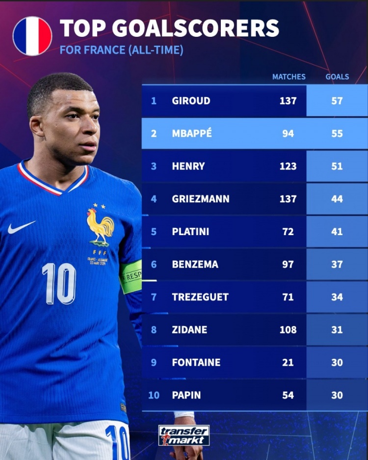 还差2球!法国队史射手榜:吉鲁57球居首,姆巴
