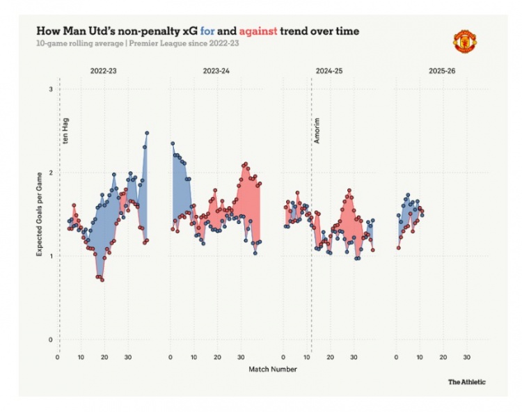 阿莫林执教曼联38场联赛获45分 尽管偶有真情流露,阿莫林深知作为俱乐部门面的责任。他立下新规:赛前必须半数球员在老特拉福德外签名,赛后由另一半完成——因太多球员曾忽视球迷。实际执行中,多数球员入场前便完成签名。 阿莫林本人常赛后留步合影,并将亲和力融入俱乐部事务。近日四岁女童参观卡灵顿时,他主动闲聊缓解紧张,还递球衣让她在镜头前展示。 将拉什福德、加纳乔、安东尼、桑乔和马拉西亚列入“清洗名单”堪称铁腕。但关窗后,他确实就留队的马拉西亚征询意见。球员们支持其回归合练,阿莫林从善如流,这位荷兰后卫甚至进入了对阵布莱顿的大名单。 曼联伤病记录大幅改善,虽如阿莫林所言部分得益于单线作战,但其拒绝冒险使用球员也是关键。尽管最初不愿中途接手,可是他在那段时间确实掌握了俱乐部与球队的宝贵细节。 如下图表所示,曼联预期进球数据正稳步上升。虽距滕哈赫首季巅峰尚有差距,但长期赤字后已显现稳定蓝线,这也促成了帅位更迭。