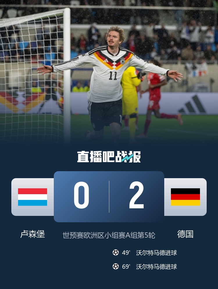 世预赛A组第5轮,德国客场2-0卢森堡,沃尔特马德双响。德国末轮战平斯洛伐克就能头名出线。 3连胜!阿根廷2-0安哥拉 梅西劳塔罗互相传射阿尔马达伤退