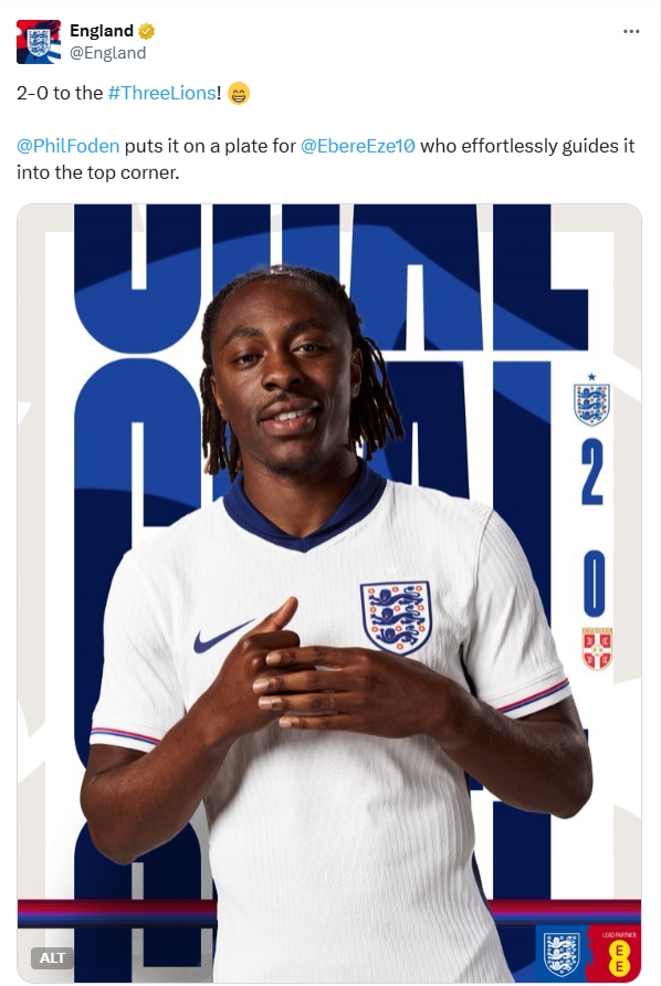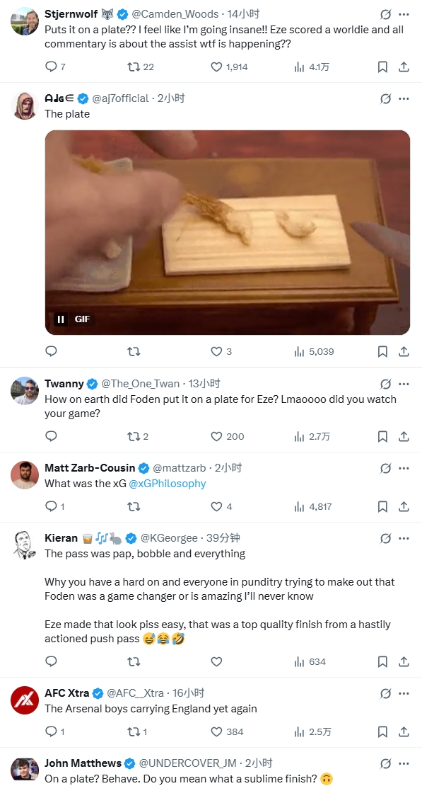 英格兰2-0击败塞尔维亚,埃泽在第90分钟破门锁定胜局,英格兰队官方的进球描述却引发了一众英国球迷的吐槽。 英格兰官方在播报进球时写道:“三狮军团2-0领先!福登将球喂到嘴边,埃泽毫不费力地将球送入上角。” 众球迷吐槽: 喂到嘴边?我要疯了!埃泽打进一球,所有评论都聚焦于助攻者,这到底是什么情况? 福登到底是怎么把球喂到埃泽嘴边的?笑死了,你们看自己队的比赛了吗? 布斯克茨也是给梅西喂到嘴边的吗? 喂到嘴边?这球的预期进球怕是<0.1。