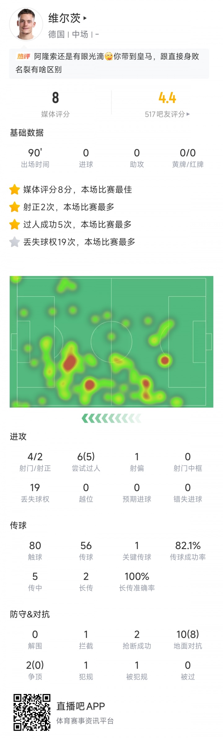 评分全场第1!维尔茨数据:6过人5成功4射2正,