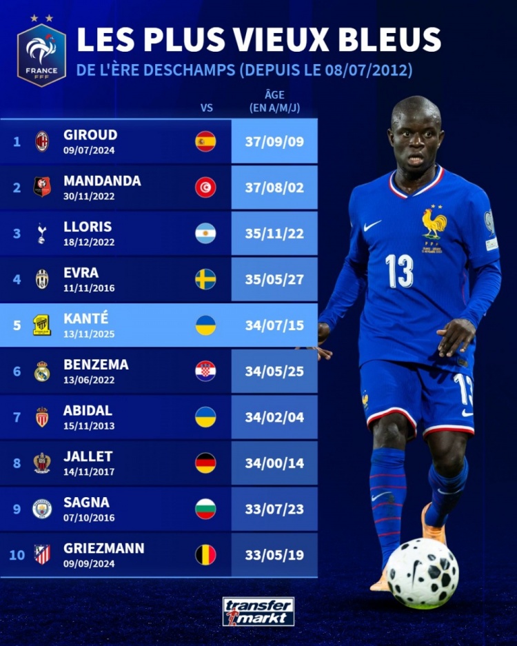 德尚麾下法国队年龄最大出场球员榜:吉鲁37岁居