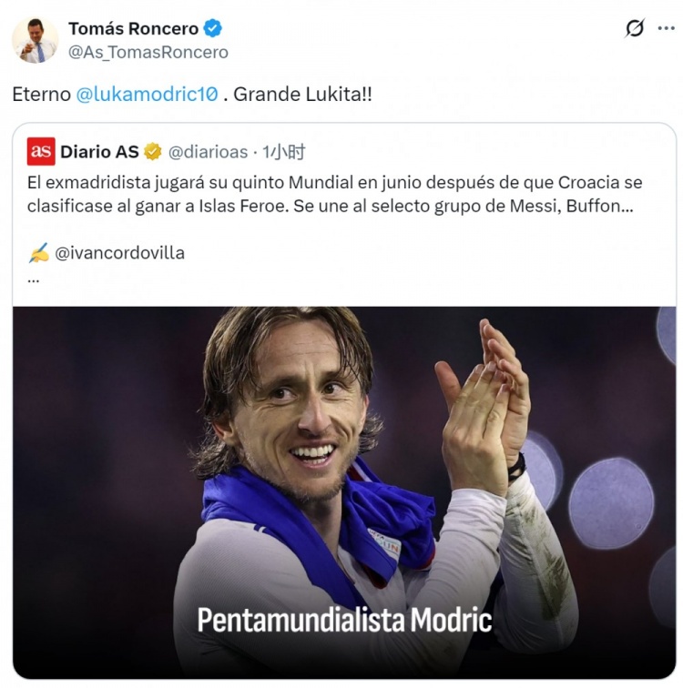 足球比分网11月15日讯 世预赛欧洲区比赛,克罗地亚3-1击败法罗群岛,获得世界杯资格。 40岁克罗地亚中场莫德里奇将迎来自己的第5届世界杯,西班牙媒体《阿斯报》主编、皇马球迷龙赛罗转发相关新闻,配文:“永恒的莫德里奇,伟大的卢卡(莫德里奇)!”